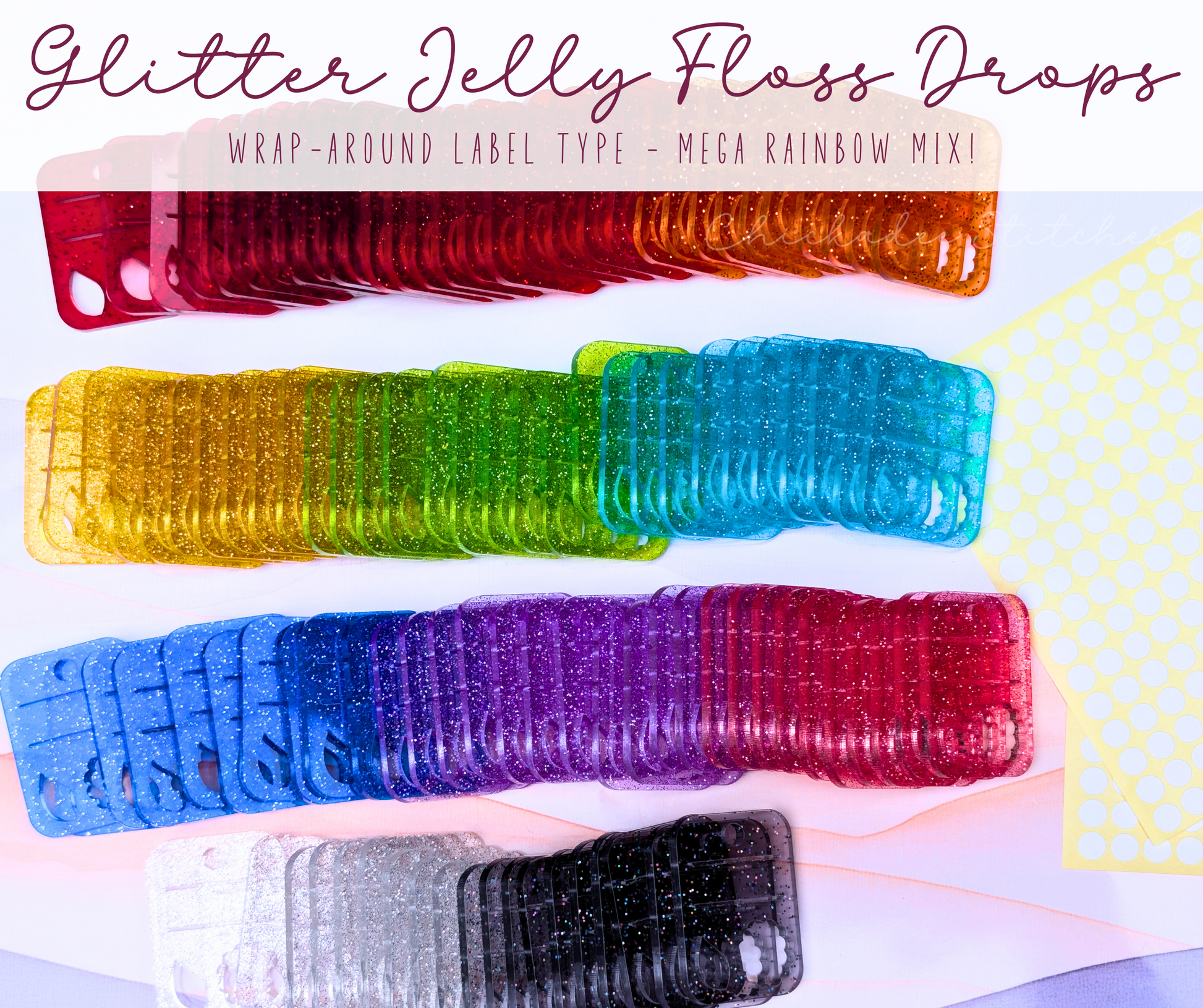 Ready to supercharge your floss organization? Save by buying in bulk with The Mega Rainbow Mix - this bulk pack is your one-stop color party, packed with all 11 of our rainbow-bright Glitter Jellies colors in bulk! Choose from an 11-pack to get 1 of each color, the 55-pack (5 of each color) or go all-in with 110 drops (10 of each color) and build your dream stitching setup with sparkle to spare.