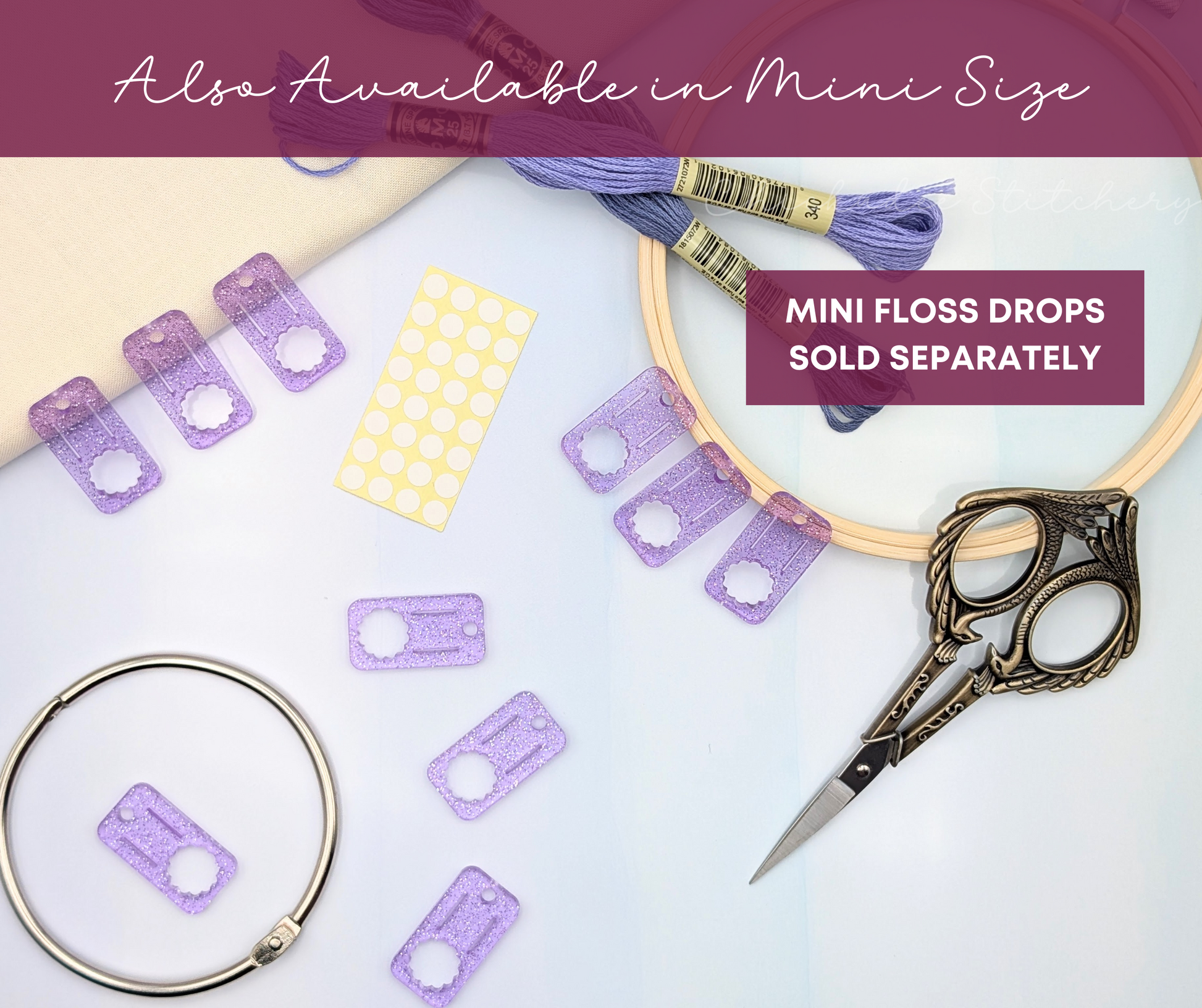 Our full size floss drops feature our Chickadee Stitchery signature flower & leaf design - these drops easily hold an entire 8.7-yard skein, and the partial strands holder keeps leftover threads neat and accessible, while the sturdy 3mm acrylic ensures durability for everyday use.