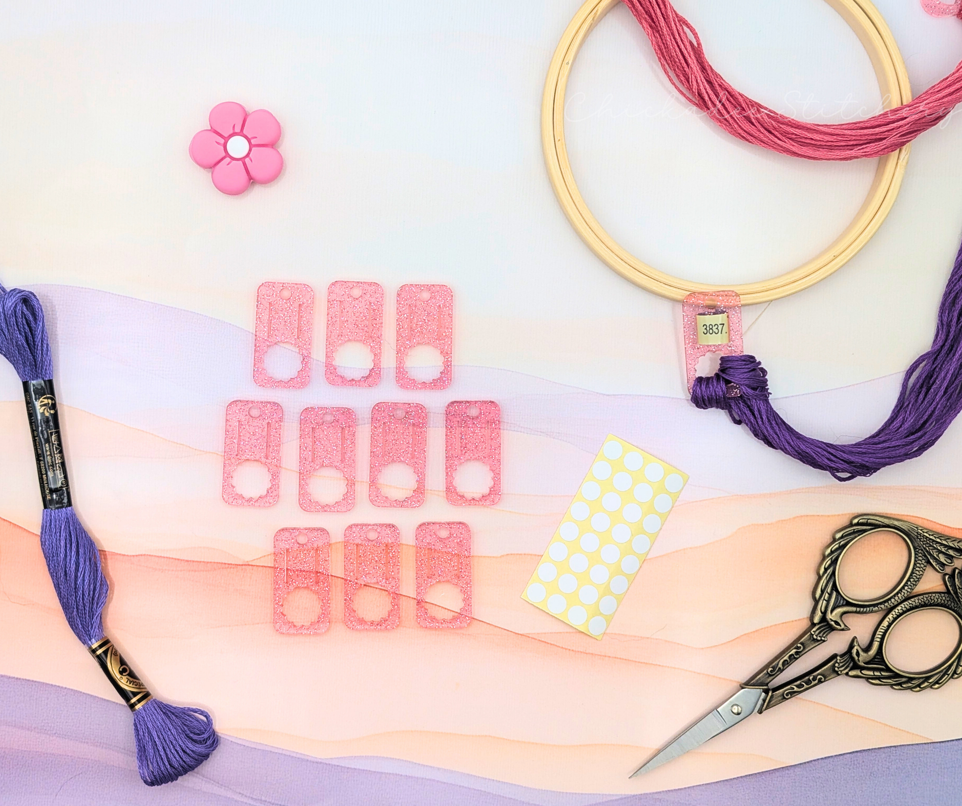 With our Wrap-Around Label Floss Drops, labeling is easy: cut the numbers off the wrapper from your embroidery floss, snip it open, thread it through the two slots to wrap around, and secure it in the back with one of the included dot stickers. Prefer stickers? Our custom color floss stickers (sold separately) work great too!