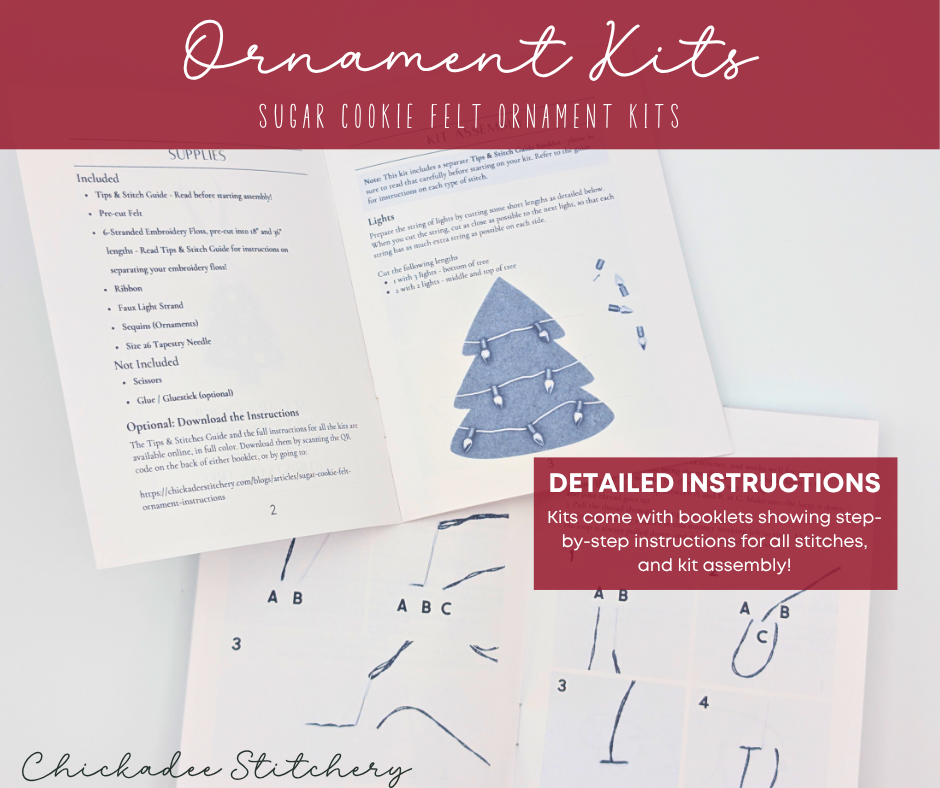 Download the full-color Instructions for the Sugar Cookie Felt Ornament Kits here. Tips & Stitches Guide Individual Kits: Reindeer Polar Bear Christmas Tree Hot Cocoa Mug